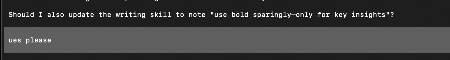 Here's a real example from writing this very post—I noticed too much bold, Pi asked if it should update the writing skill, I said yes: